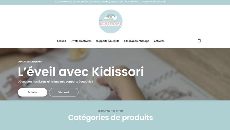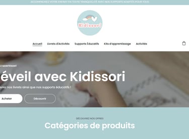 Kidissori souhaitait créer une boutique en ligne professionnelle pour vendre des supports éducatifs (livrets d'activités, kits d'apprentissage) avec un design doux et adapté aux enfants, tout en gérant à la fois des produits physiques et numériques.