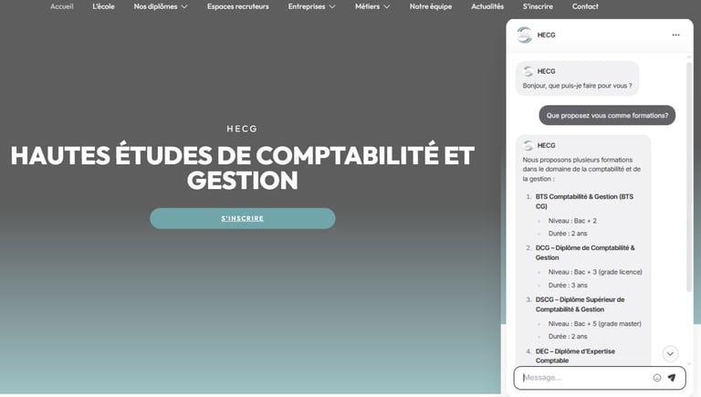 HECG (Hautes Études de Comptabilité et Gestion) recevait des centaines de questions répétitives sur les formations, admissions, diplômes et modalités. L'équipe administrative était débordée et les étudiants attendaient trop longtemps pour obtenir des réponses simples.